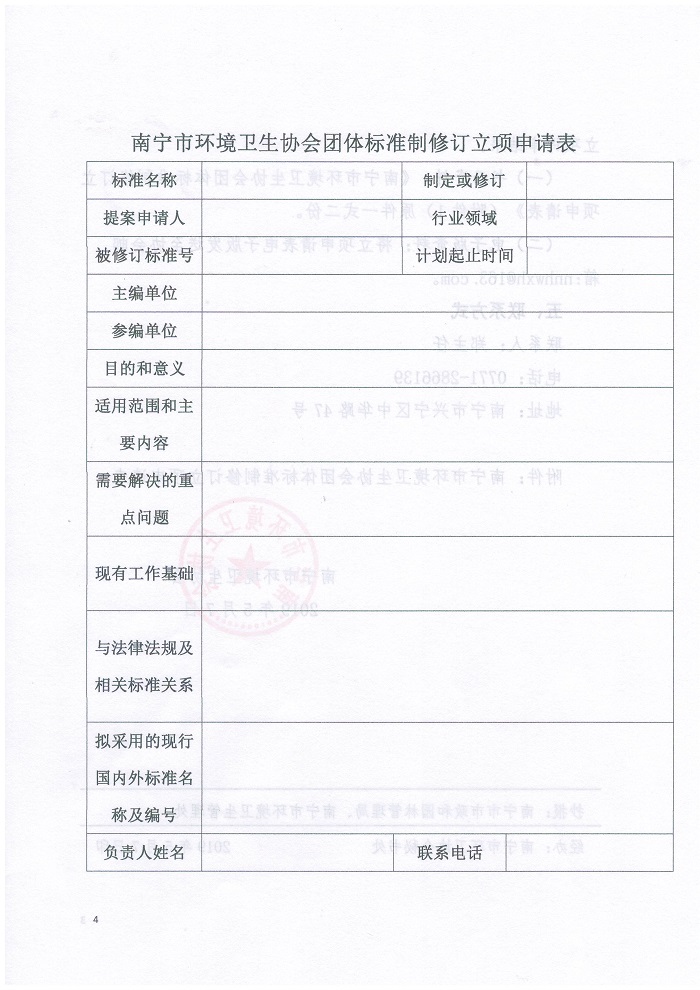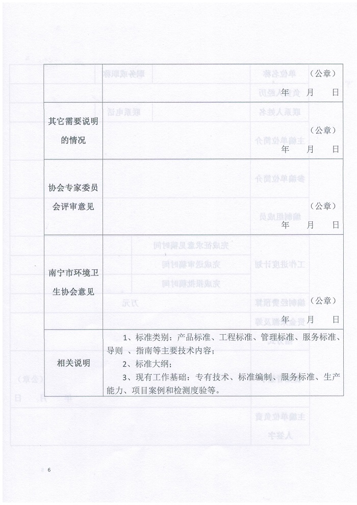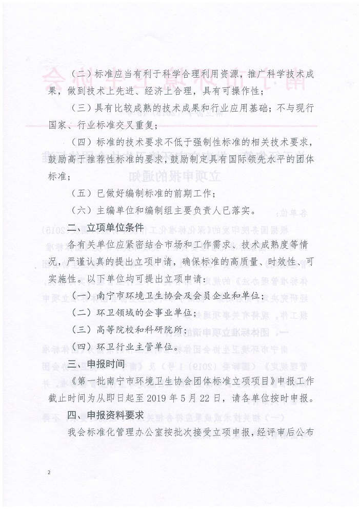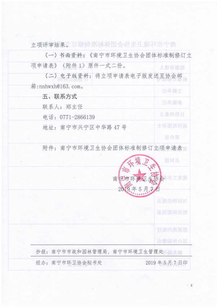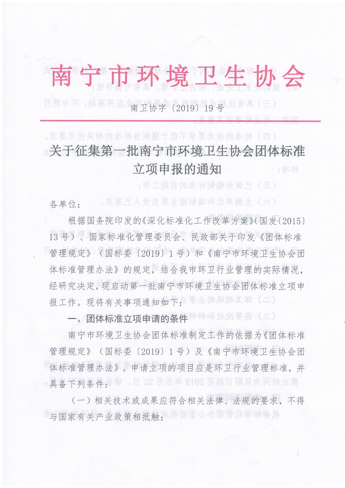 根据国务院印发的《深化标准化工作改革方案》(国发〔2015〕13号)、国家标准化管理委员会、民政部关于印发《团体标准管理规定》(国标委〔2019〕1号)和《南宁市环境卫生协会团体标准管理办法》的规定,结合我市环卫行业管理的实际情况,经研究决定,现启动第一批南宁市环境卫生协会团体标准立项申报工作。