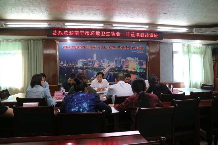 5月10日下午,南宁环境卫生协会陈庆福会长一行5人参访团来到南宁市青秀区环境卫生管理站进行走访,交流座谈在青秀区环卫站三楼会议室举行。青秀区环卫站党总支部书记、站长黄捷,党总支部副书记张建龙,副站长周红权、宋微微、谭炜以及办公室主任刘振武等领导班子参加了本次会议。