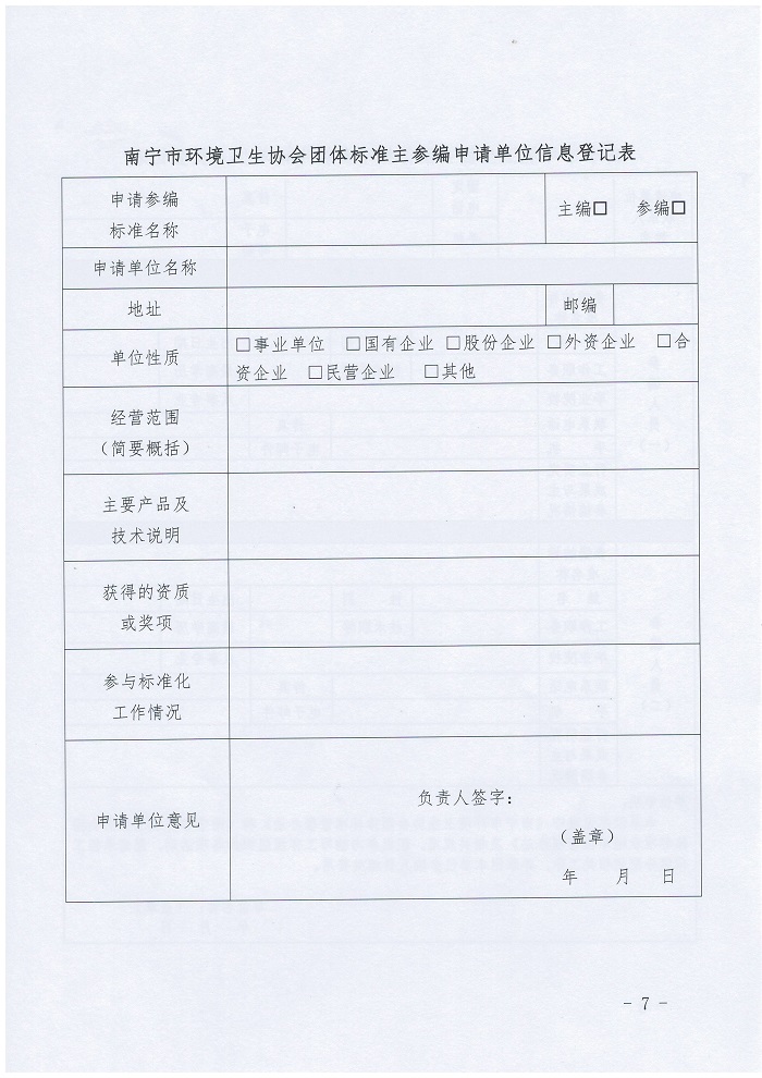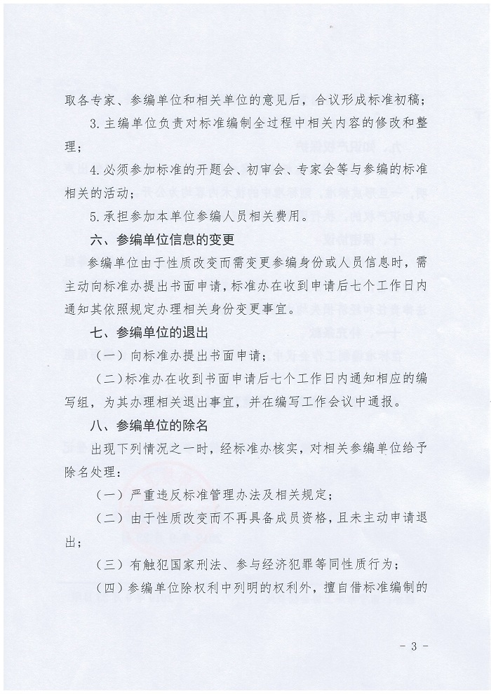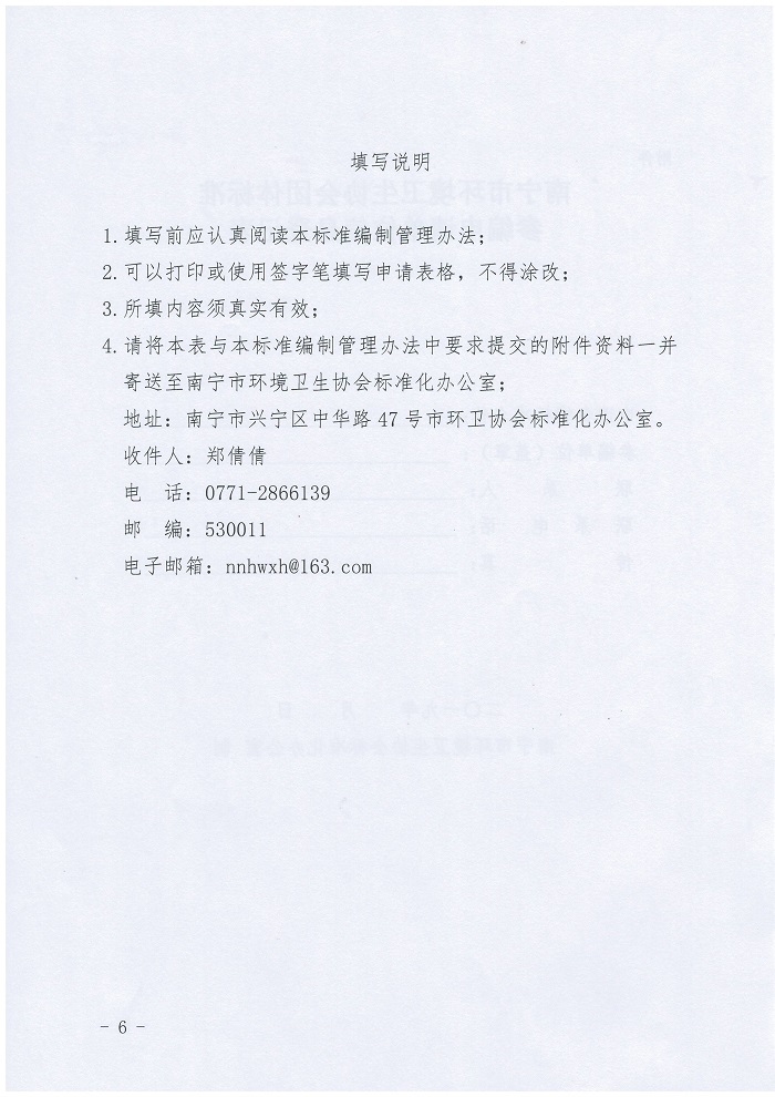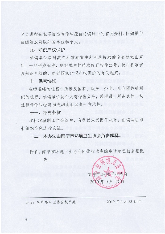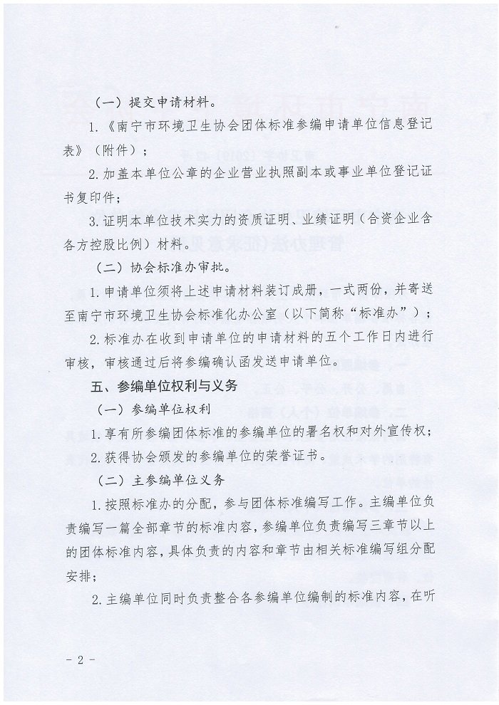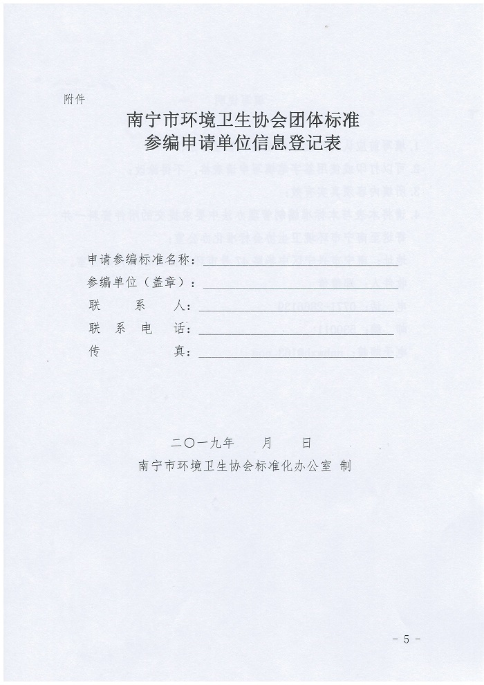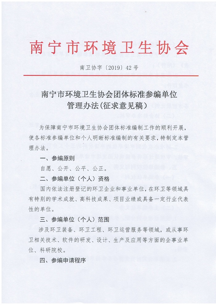 为保障南宁市环境卫生协会团体标准编制工作的顺利开展,使各标准参编单位和个人明晰标准编制的有关要求,特制定《南宁市环境卫生协会团体标准参编单位管理办法(征求意见稿)》,现向各会员单位征集相关意见和建议,请有修改意见和建议的单位于2019年9月30日前发送至协会邮箱nnhwxh@163.com,并加盖公章。联系人:郑主任,0771-2866139。
