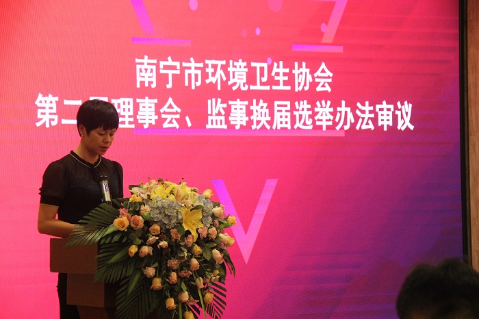 广西布瑞思科环保科技有限公司胡绍萍女士宣读第二届理事会、监事换届选举办法