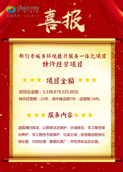 侨银环保此次中标的都匀市城乡环境提升服务一体化项目特许经营项目,是“城市大管家”与“环保创新技术”业务的综合延 伸,服务内容涵盖道路清扫保洁、公厕保洁及维护、水域保洁、非工程性绿化养护、非工程性市政维护、垃圾分类;投资建设厨余 垃圾处置、污泥处理、粪便处置厂,并负责收运及处置等。