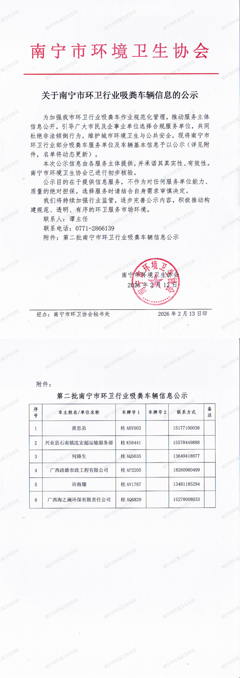 关于南宁市环卫行业吸粪车辆信息的公示(第二批)