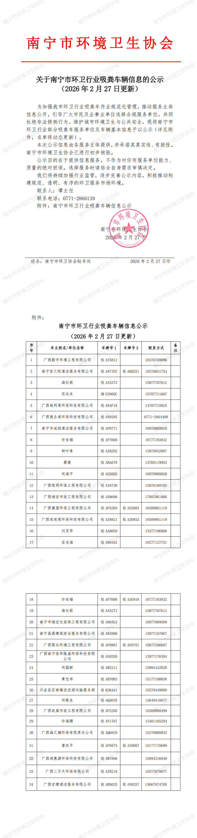 关于南宁市环卫行业吸粪车辆信息的公示(20260227更新)